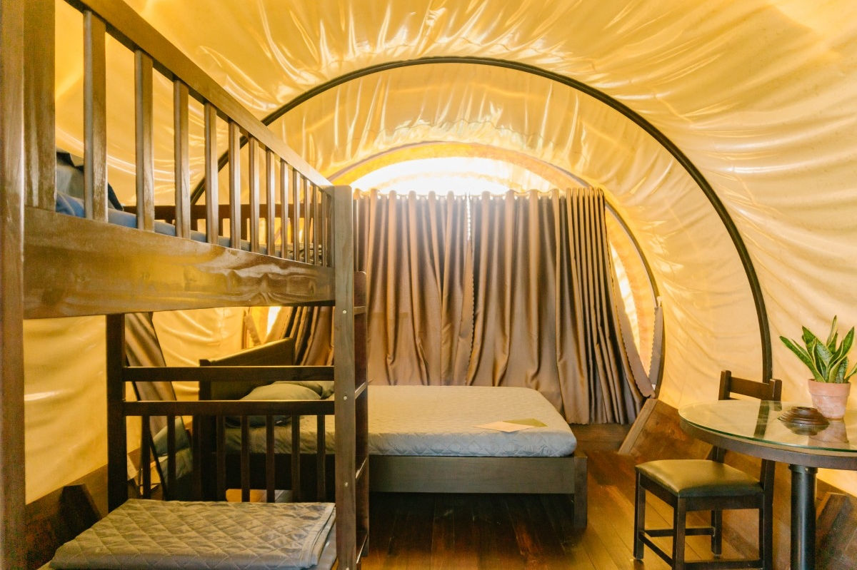Lều Xe ngựa độc đáo: có giường tầng, WC riêng, không gian riêng tư nhưng vẫn gần gũi thiên nhiên – trải nghiệm cắm trại tiện nghi và thú vị.